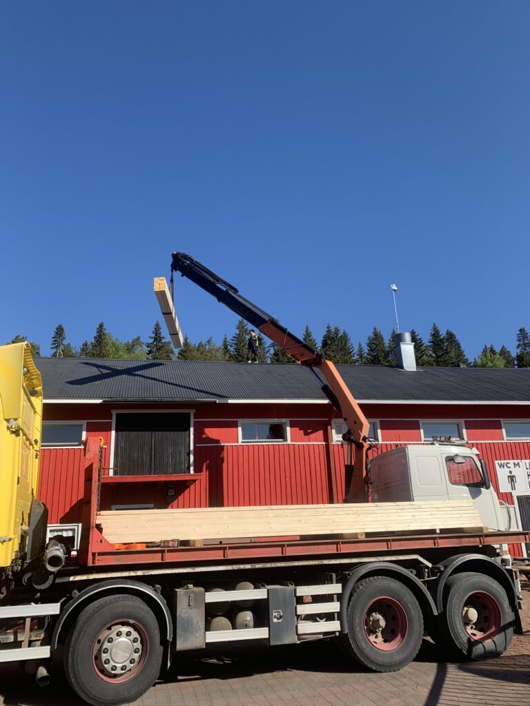 VKäytössämme on HIAB-nosturi, jolla voimme vaivattomasti suorittaa raskaammat nostotyöt, kuten kattopalkkien, teräsrakenteiden yms. nostotyöt. Saamme omalla kalustolla kuljetettua suurempiakin eriä suoraan rautakaupasta työmaalle ja voimme samalla nostaa esimerkiksi kattopellit ja puutavaran suoraan katolle. Suurtehoimurilla voidaan poistaa saneerauskohteesta maa-ainesta, eristeitä sekä purkutöistä syntyvää pientä jätettä vaivattomasti. Puhallusvillan asennus kuuluu myös palveluvalikoimaamme.
